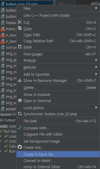- Android 스튜디오에서 NinePatch 이미지를 생성하려는 PNG 이미지를 마우스 오른쪽 버튼으로 클릭하고 Create 9-patch file을 클릭합니다.