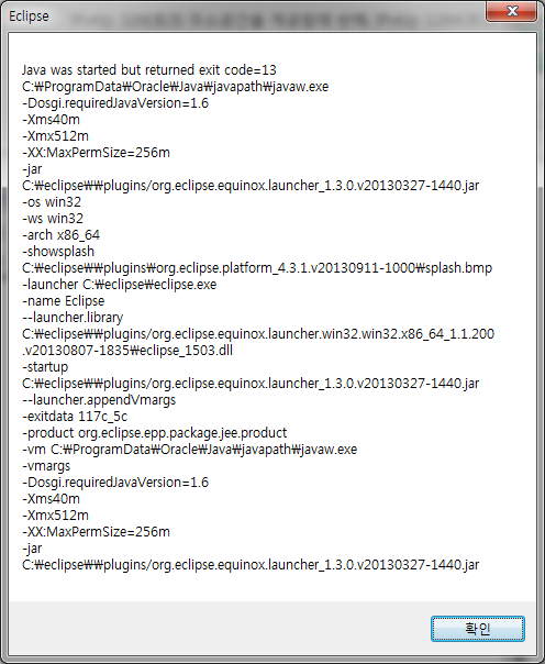 이클립스(Eclipse) exit code=13 Error 발생시 해결방법