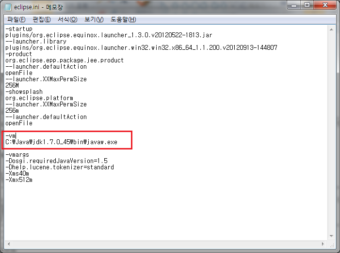 Eclipse가 설치된 폴더로 가서 eclipse.ini 파일을 메모장 등의 텍스트 편집 도구로 불러옵니다.