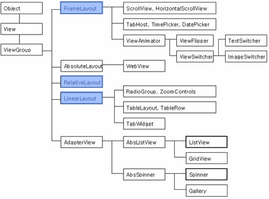 대표적으로 LinearLayout, RelativeLayout, FrameLayout 이 있다.