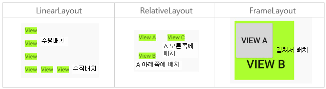 뷰(View)가 다양하듯이 뷰그룹(ViewGroup)도 다양하며 각 고유한 배치 방식을 가진다.
