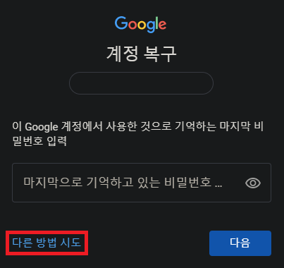 2) 안내 절차와 같이 복구 단계 진행, 비밀번호를 해커가 변경한 경우 마지막 비밀번호 입력 시도후 다른방법 시도
