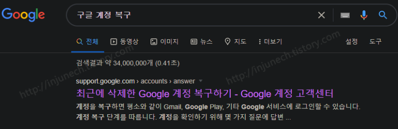 구글 계정 복구 단계 진입 ( https://support.google.com/accounts/answer/6236295?hl=ko )