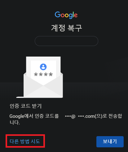 3) 인증 코드 받기 시도 후 계속 인증 코드가 안오거나, 아래 전송하겠다고한 메일 주소의 글자수가 기존 글자수와 안맞는 경우에는 해커가 복구용 이메일 주소를 변경한 경우 이므로 다시 다른방법 시도하여 해커가 변경한 이메일 주소 이외에 사용하는 이메일 주소로 인증코드 전송 요청하고, 인증코드 입력 - 이 경우로 인증코드 입력 하더라도 구글 에서 복구 가능 이메일인지 확실하지 않으므로 아래와 같이 고객 센터 추가 해킹 사실 알려야함.