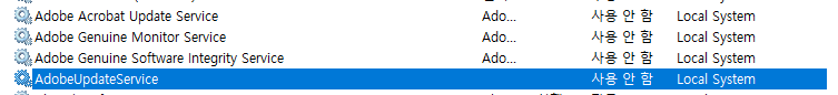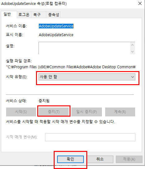 시작 유형 - 사용 안함 / 서비스 상태 - 중지