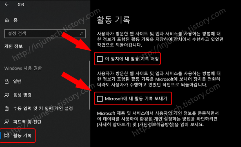 사이드 바의 Windows 권한 아래에있는 "활동 기록" 옵션을 클릭 한 다음 "이 장치에 내 활동 기록 저장", "Microsoft에 내 활동 기록 보내기" 확인란을 선택 취소합니다.