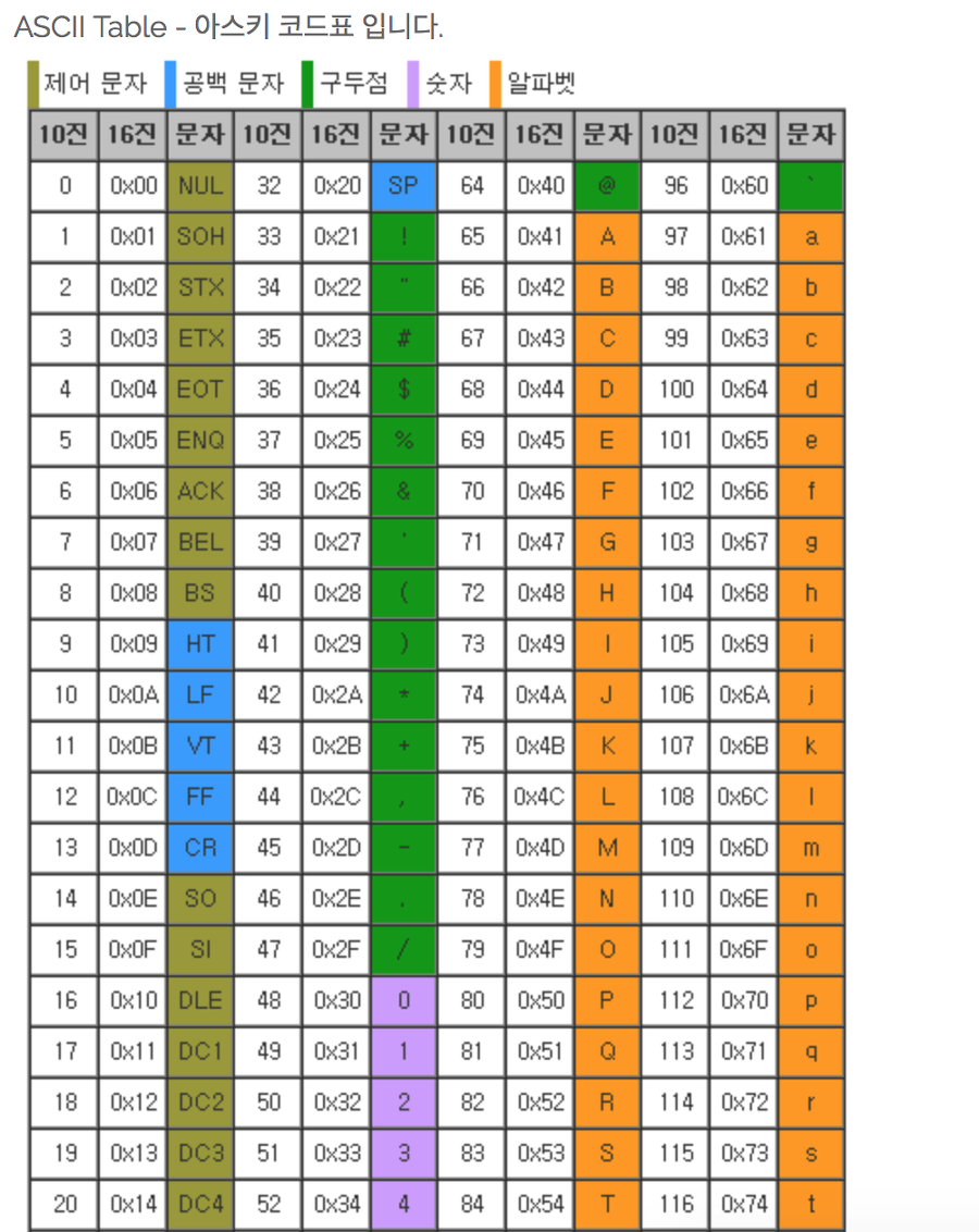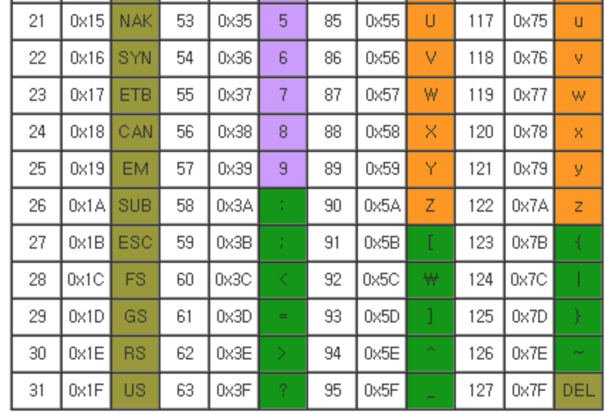다시 표로 돌아가서 숫자 0~9와 문자 0~9가 다르다는것을 알 수 있을 것이다.