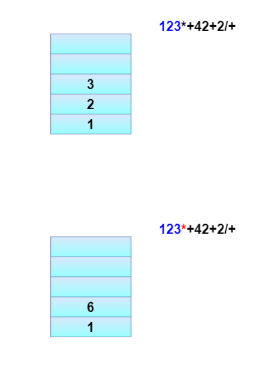 우선 숫자는 모조리 스택에 집어 넣습니다. 1, 2, 3이 숫자이므로 스택이 집어넣지요. 그 후 연산자가 나오게 되면 스택에 두 수를 꺼내 계산하고 다시 스택에 집어 넣습니다. 2와 3을 꺼내 곱하면 6이 되니 6을 다시 스택에 push하는 것이죠.
