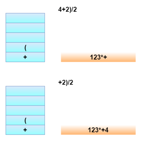 Ex) 1+2*3+(4+2)/2 => ((1+(2*3)+((4+2)/2))) => ((1(23)*)+((42)+2)/))+ => 123*+42+2/+