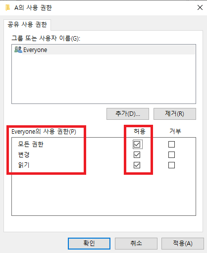 7) 공유 사용 권한 지정 > Everyone 모든 권한 지정 (필요시 특정 계정 혹은 사용자 그룹 등을 별도로 지정)