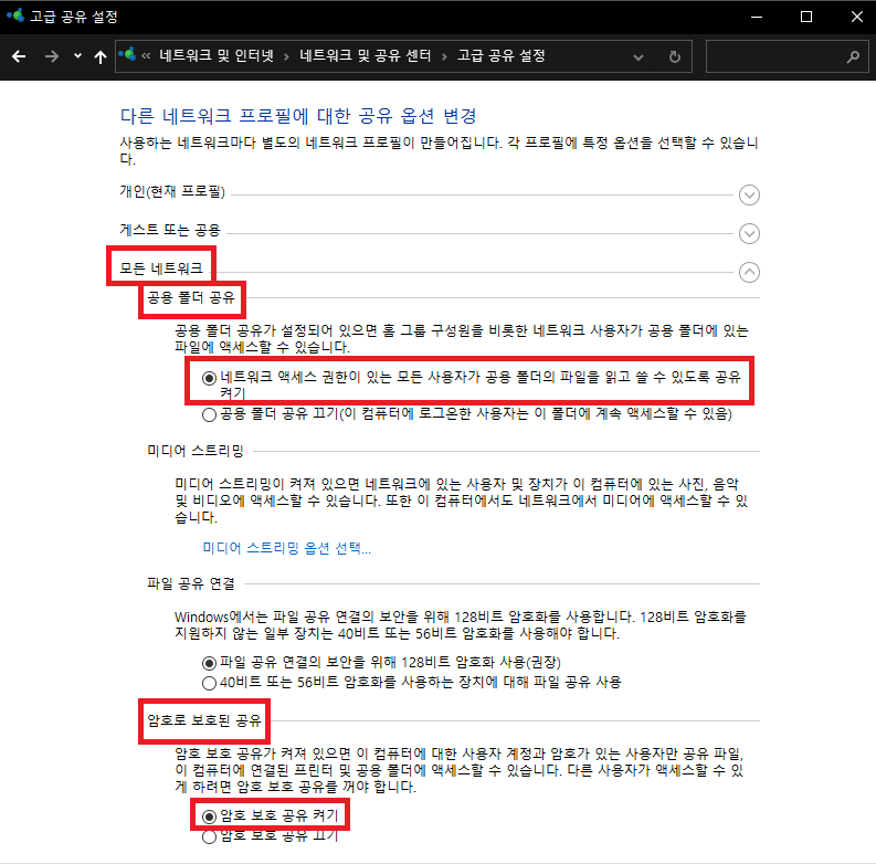 2) 네트워크 및 공유 센터 > 고급 공유 설정 변경