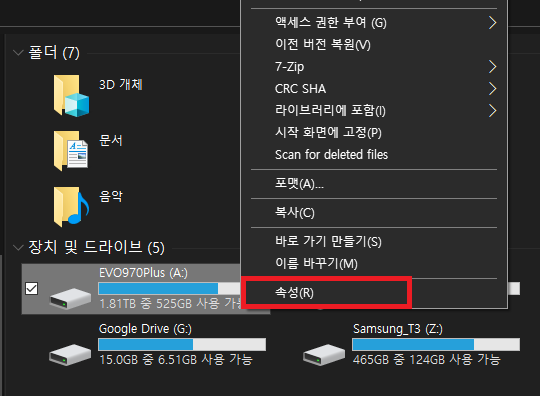 4) 공유하고자 하는 폴더를 선택하고 마우스 오른쪽 버튼 눌러 속성 선택