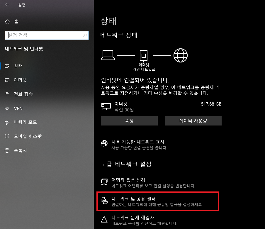 1) 설정 > 네트워크 상태 > 네트워크 및 공유 센터