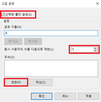 6) 고급공유 > 선택한 폴더 공유 > 동시 사용자수 지정