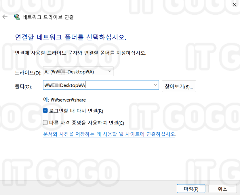 2. 이제 Notebook다른 PC에서 Desktop의 네트워크 공유 폴더로 지정된 A:\ Drive를 네트워크 드라이브 A:\ 으로 지정해준다. (원하는 알파벳으로 지정해도 무관하다)