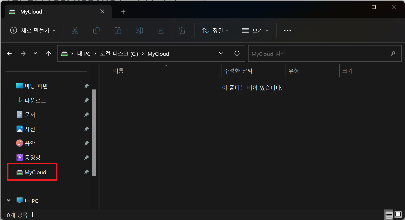 나는 C 드라이브 폴더에 MyCloud라는 폴더를 하나 만들어 주고 폴더의 아이콘까지 바꿔서 즐겨찾기에 추가해주었다.