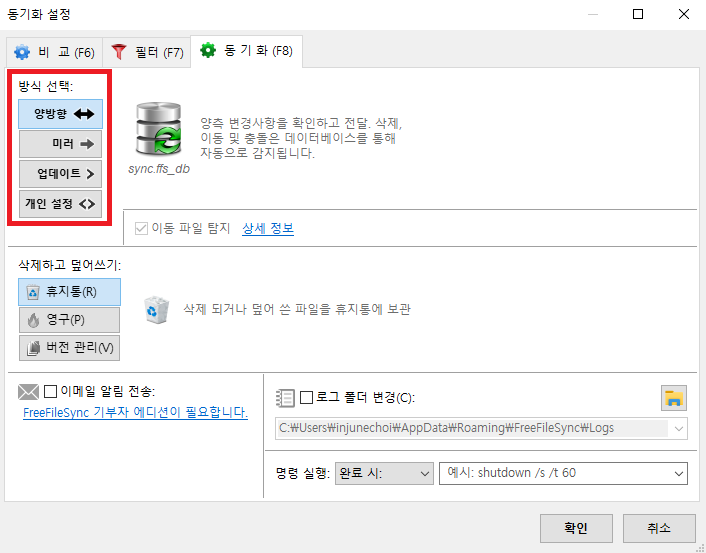 난 양쪽 폴더를 각각 편집할수 있는 환경으로 사용할 예정이라 양방향 동기화 방식으로 선택