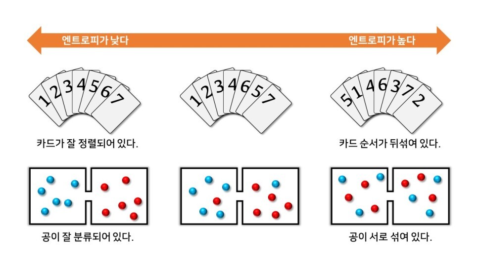 '무질서도'라는 용어가 생소하게 느껴질 수도 있겠는데 '우리가 모르는 정도'라고 표현해도 틀린 것은 아니다. 첫 번째의 경우는 entropy가 낮은 상태이고 둘째 경우는 entropy가 높은 상태이다.